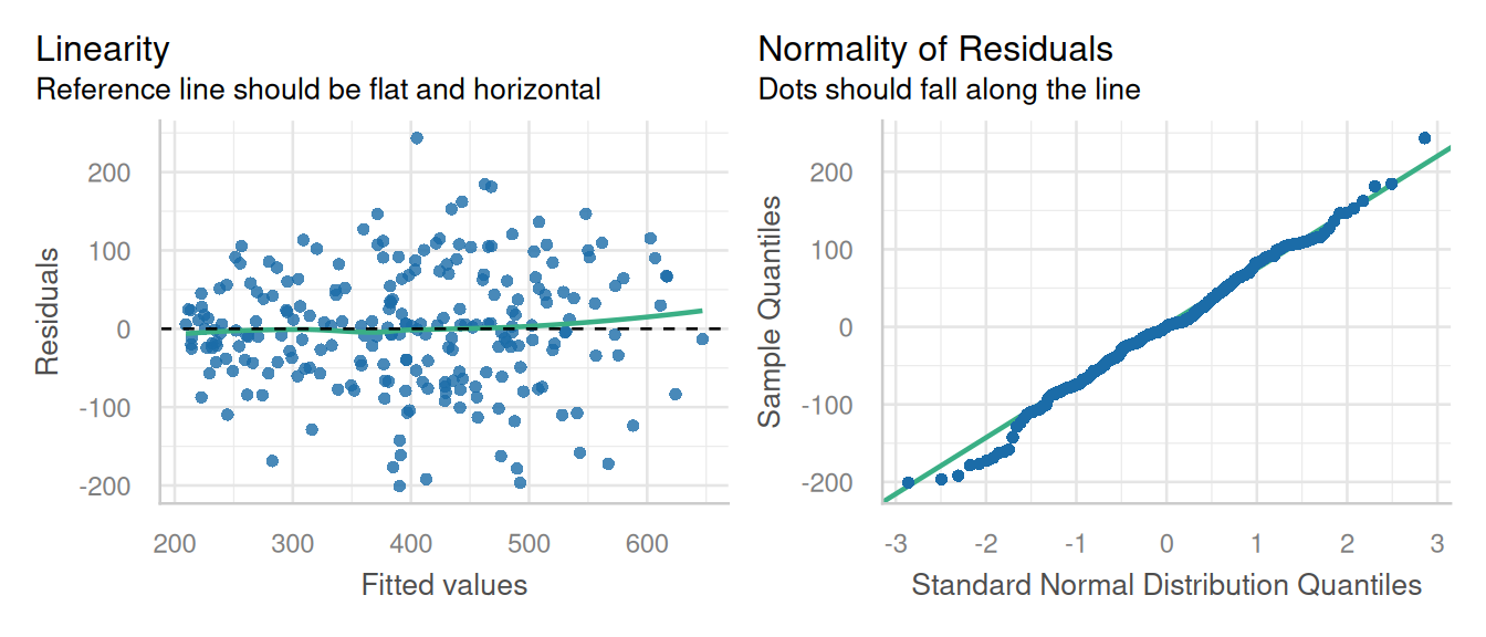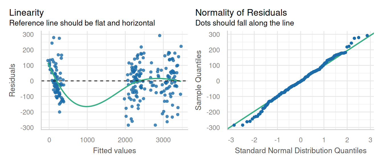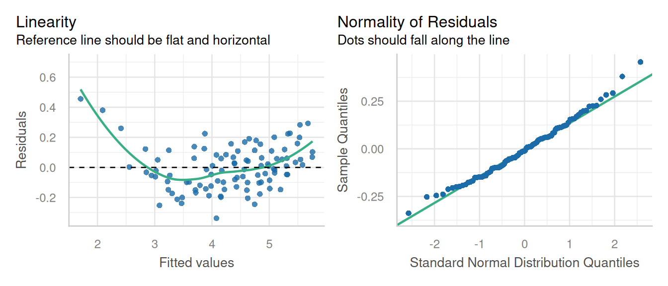 check_model(pfit1, check = c('linearity', 'qq'), detrend=FALSE, alpha =0)